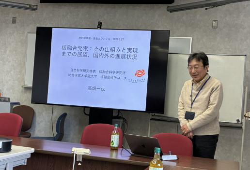 「核融合発電:その仕組みと実現までの展望,国内外の進展状況」という演題で核融合科学研究所/総合研究大学院大学 高畑一也教授による講演が 2026年1月27日自然科学研究機構 核融合科学研究所会議室で行われた。講演では核融合反応を用いた核融合発電の仕組みや放射線や放射性物質に対する安全性、核融合発電の研究開発の状況等について紹介された。